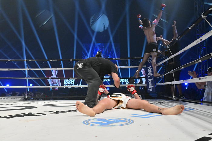 3R、壱がいきなり仕掛けるが、右ストレートを空振りしたところに右フックをもらってまたもダウン。森岡はジャブ、左右フック。右フックで壱が後ろに倒れ、5度目のダウンを奪って森岡のKO勝ちとなった。