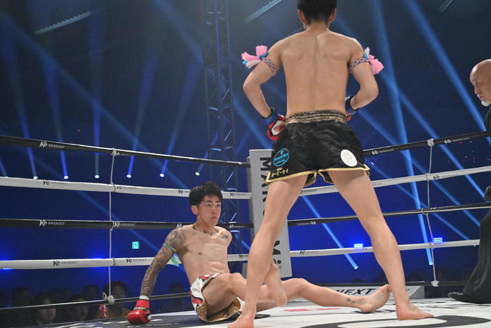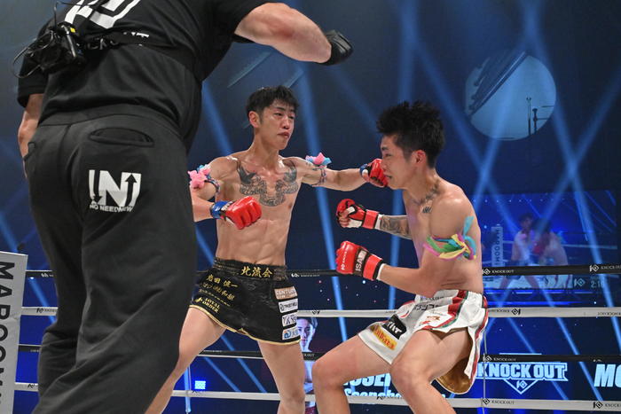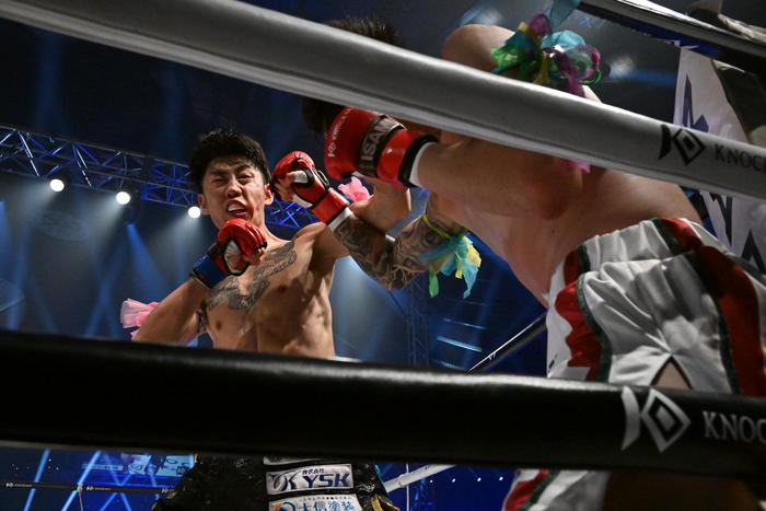 2R、森岡が右インロー、壱が右フックを放つと一瞬棒立ちとなった森岡だが、すぐに左右フックで逆襲。森岡が左フック、コーナーを背負った壱に右フックを見舞ってダウンを追加。壱は立ち上がると左ミドル、左右のパンチで前へ出ていく。森岡は右ヒジ。前へ出て逆転を狙いフックを繰り出していく壱。