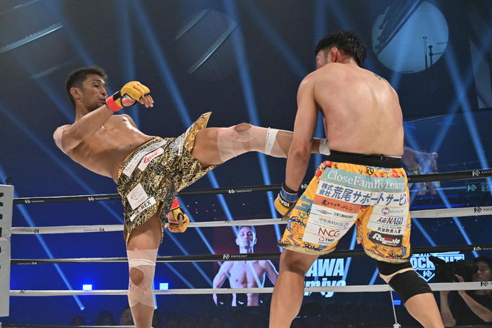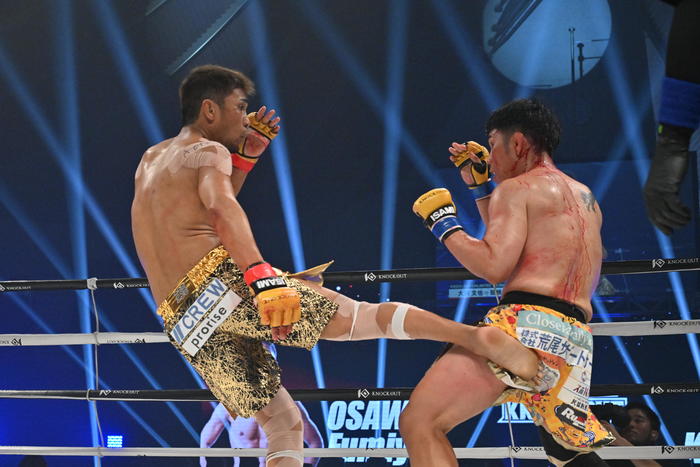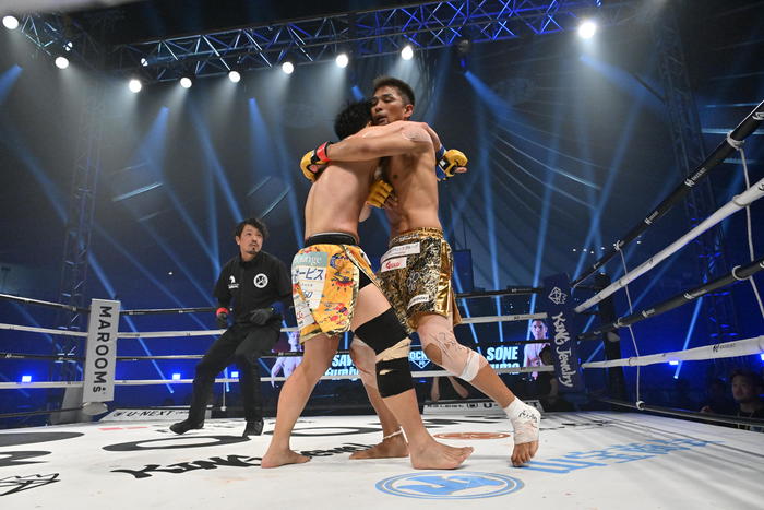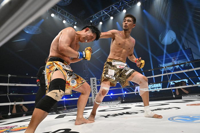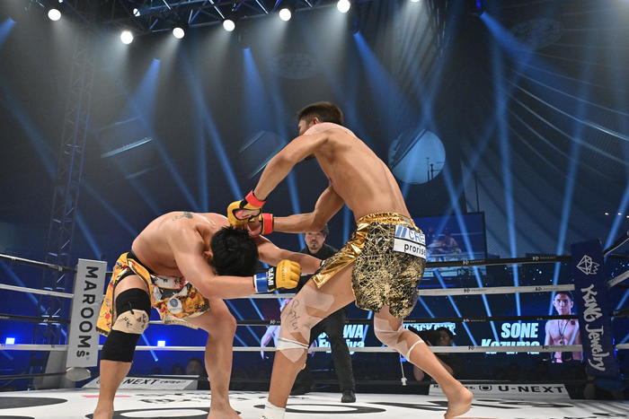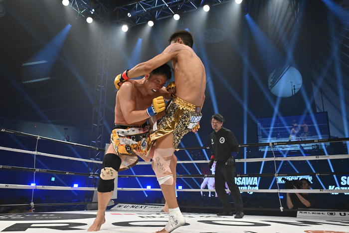 2R、大沢が右カーフ、右ロー。祖根が前に出てくると大沢はロープやコーナーを背にしてテイクダウンを防ぐ。大沢の右ローに祖根が左フックで前へ出たところでバッティングとなり、試合は中断。再開後、組んでくる祖根にヒジを合わせる大沢。