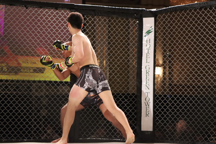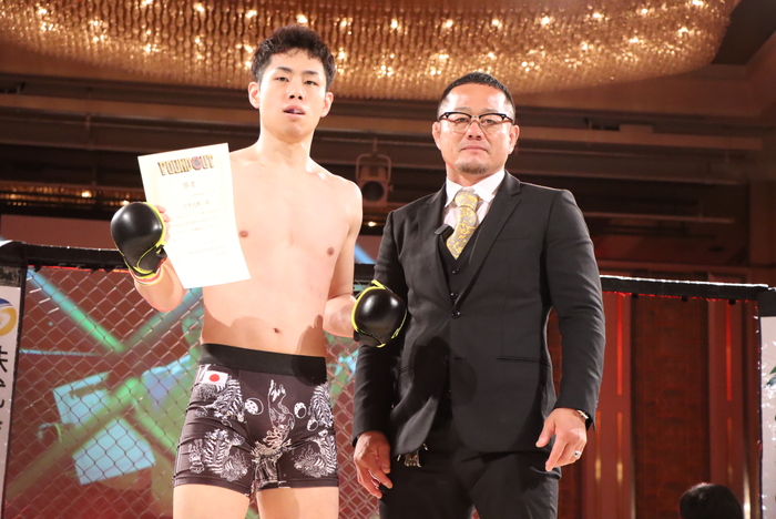 2R、左右の蹴りの今井は、竹内の組みに体を入れ替えヒザ蹴り。ブレーク。左ミドルハイで詰めた今井は右ストレート! 竹内がダウン。パウンドにレフェリーが間に入った。