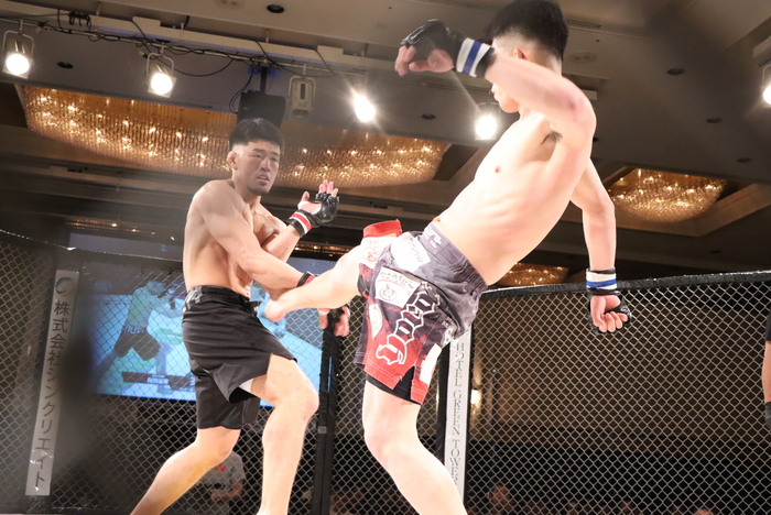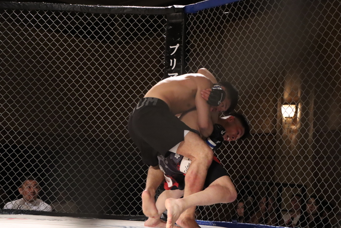 1R、岡田のシングルレッグを切った大搗。ともにサウスポー構えから左ローを突き、右ミドル、左ロー、左オーバーハンドからの岡田の組みに大搗が首投げ払い腰。凌ぐ岡田のボディロックを切り返して大搗が上からパウンド。
