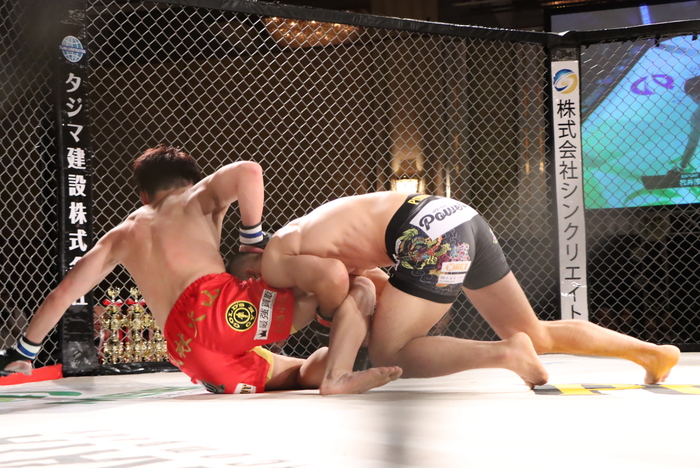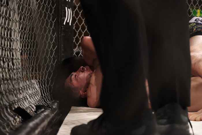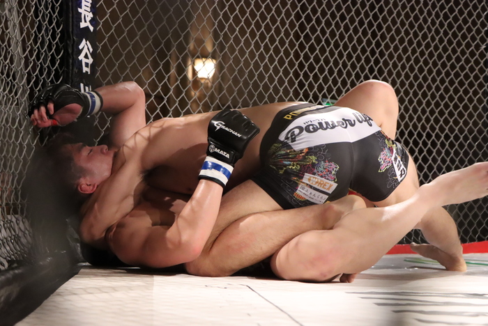 2R、右ローの武田。松井のシングルレッグをスプロールするも、なおも松井は詰めてダブルレッグテイクダウン。下の手首を掴んで寝かせてハーフから左で枕。金網で上体立てようとする武田だが、松井は左脇を開けさせて肩固め。タップを奪った。