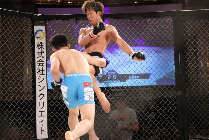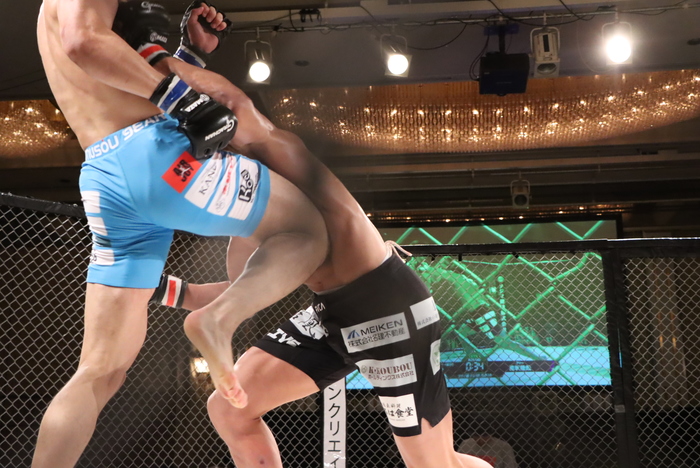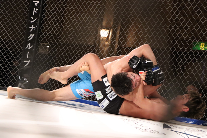 2R、右ストレートを当てる能坂は右インローも。小林の下からの仕掛けを潰す。右で詰める能坂に、小林はバックテイクから4の字、おたつロック。足で外した能坂が正対してトップに。
