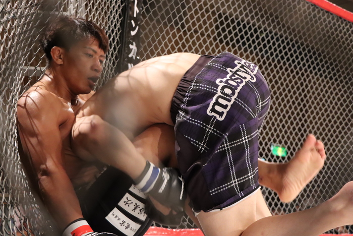 2R、八木は右ローからシングルレッグ、バック狙いも落とした藤村が上に。ケージまで這い、上体立てる八木に1R同様に押し込み、足を束ねに行く藤村。ケージで立つ八木は体入れ替えシングルレッグも、胴をクラッチして上になる藤村。下の八木はいったん背中着くがブリッジでリバース。下からダブルオーバーフックの藤村を八木は少し持ち上げスラム。上でホーン。
