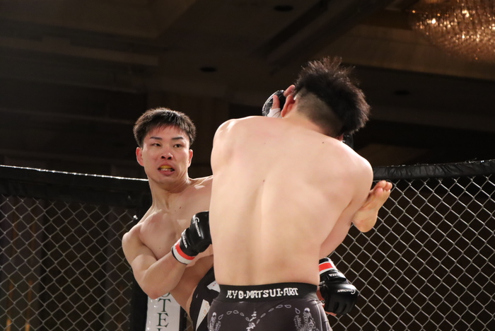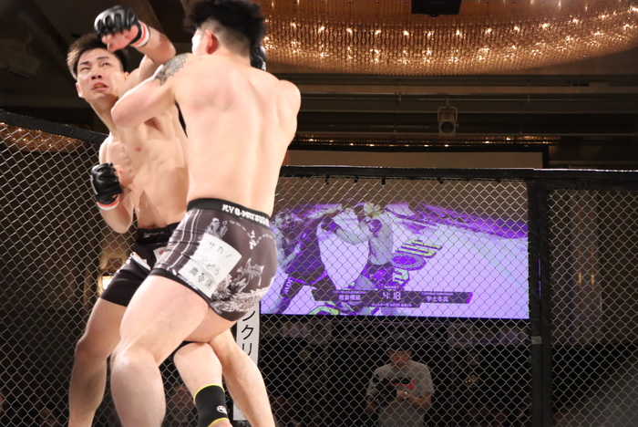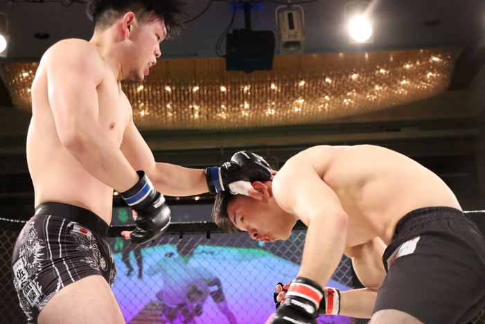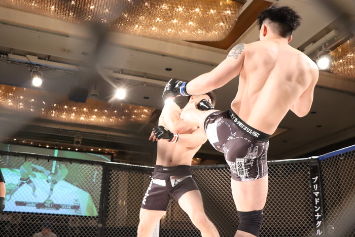 1R、サウスポー構えの宇土は左ハイ、左ストレートで金網に詰めるが、体を入れ替える岩倉のバックに回るが、足をかけられず前方に落とされる。