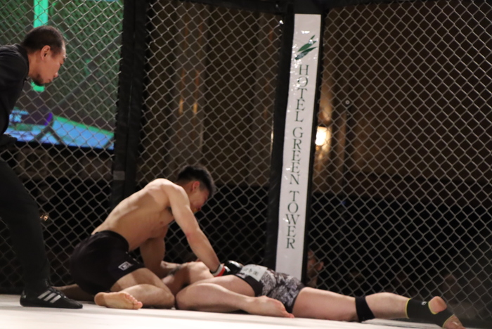 左から右の逆ワンツーで詰める宇土に、岩倉も左ミドルハイを肩口に当てる。ワンツーの連打で詰める宇土に、ケージ背にした岩倉は右ストレート一閃! 前のめりに崩れた宇土をパウンドアウトした。