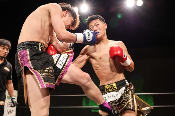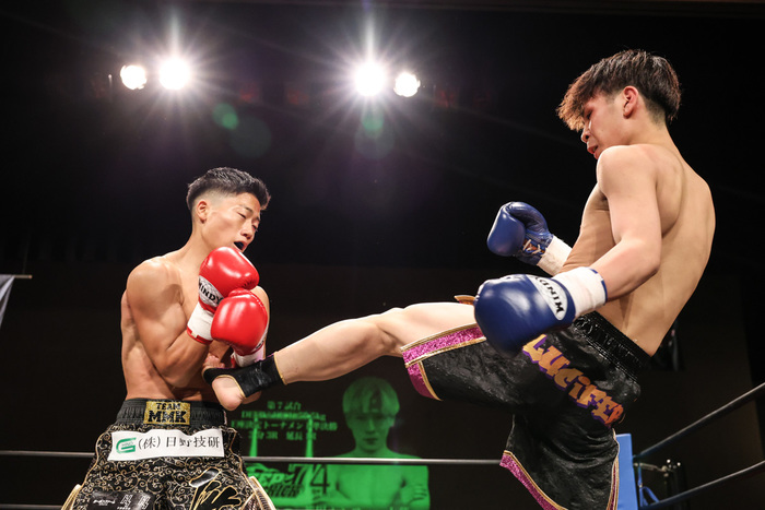 試合は1R、サウスポーに構える荒川は前手で距離を測りながらローにミドル・ハイと蹴りを中心に走らせ、入ってきたところに右フック・ストレートと返していく。対する細濱はじっくりとタイミングを計りながら一気に踏み込んで細かいパンチ連打に繋いでいく。互いにパンチ・蹴りと繰り出すも荒川は蹴りを軸に、細濱はパンチを軸に攻勢を狙う。