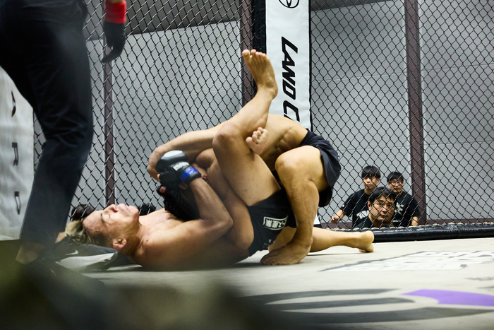 そのままマウントを奪う南風原だが、松浦は右腕をオーバーフックして左にブリッジでリバーサル。フルガードの南風原は左足を腰にあてて松浦の右手を送って左足を首もとに、三角絞めへ。少し持ち上げスラムした松浦だが、下の南風原が頭を引き付け絞めると、松浦が失神。南風原が一本勝ちした。