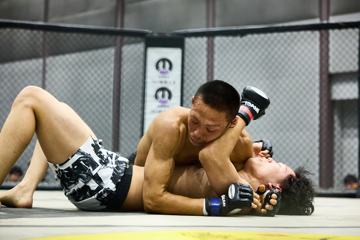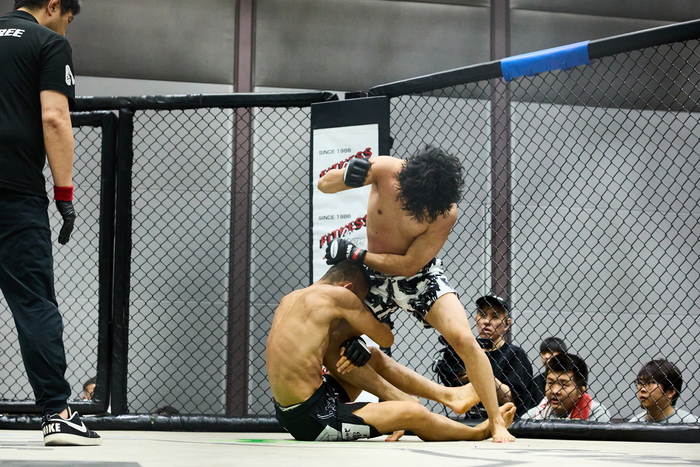 2R、いきなりシングルレッグ狙いのムクロックに右の水面蹴りを狙うおえゆうた。しかし構わずシングルレッグテイクダウンのおえゆうたテイクダウン。おえゆうたのギロチンチョークを外してパス、右で脇差しサイドに。細かい右鉄槌、左パウンド。亀になるおえゆうたに両足を入れてバック、4の字ロック、リアネイキドチョークへ。腰をずらして中腰になり前に落としたおえゆうたは、ガードの中からパウンド。