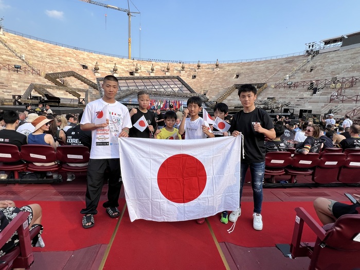 古代ローマ時代の円形闘技場前で日の丸を掲げる日本選手団(C)WBCムエタイJAPAN