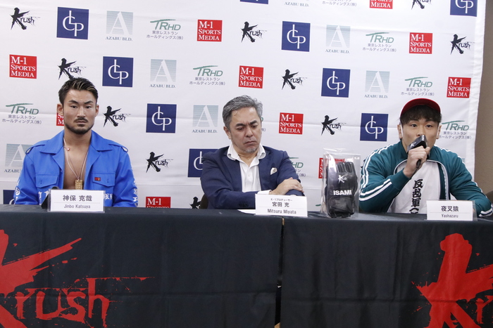 メインイベントに選ばれたことについて、夜叉猿は「伝統あるKrushでメインを任されるのはめちゃめちゃ嬉しいし、誇りに思う。メインは何回かやっていて、去年のオーストラリア遠征に比べたらやられた仕打ちが全然違う。だからそこはそんなに緊張してない。むしろ楽しみかなって感じです」とし、神保は「OFG自体も俺のわがままでやってくれると運営の人が言っていたので、俺のわがままをきいて下さってありがとうございます」とそれぞれコメント。