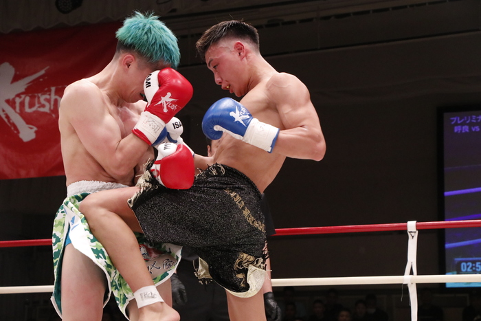 3R、松谷はボディへのヒザを連発し、右ローから右カカト蹴り。ヒザを何度ももらう呼良だが、打ち合いになると一歩も退かずに左右フックを打ち返す。松谷は声を出しながら右ストレート、左フック、ヒザ。