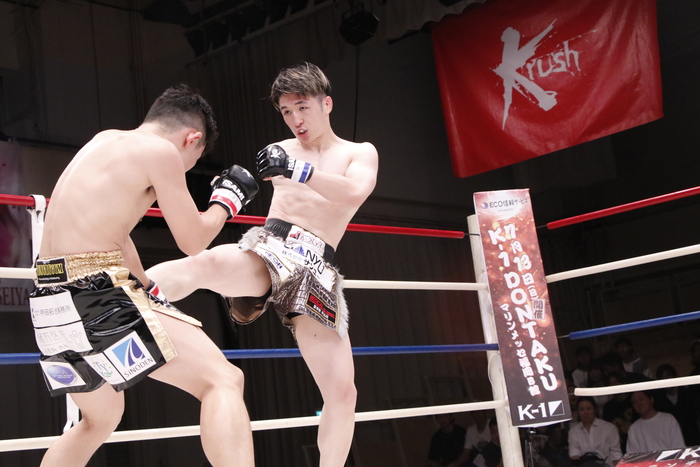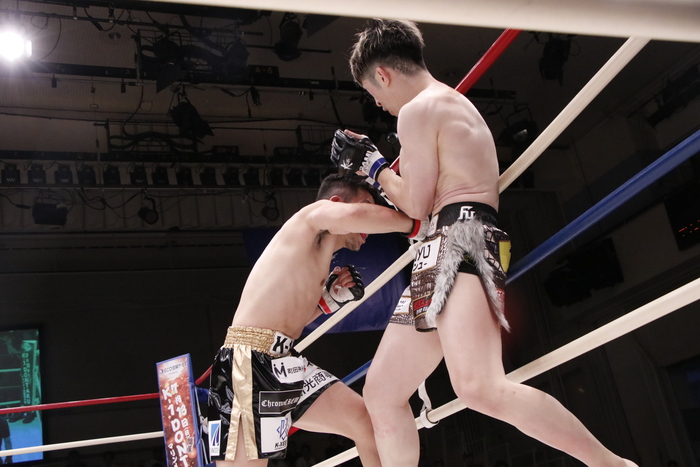 2R、心直は左ミドルハイを多用し、左ミドルからの左ストレートを狙う。悠斗は右フックを放つと、心直が一瞬間をおいてしゃがみ込みダウン。立ち上がると心直は左ミドル、前蹴り、ヒザでボディを攻める。