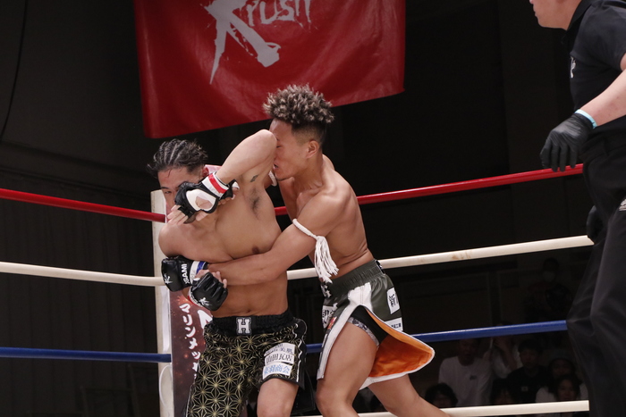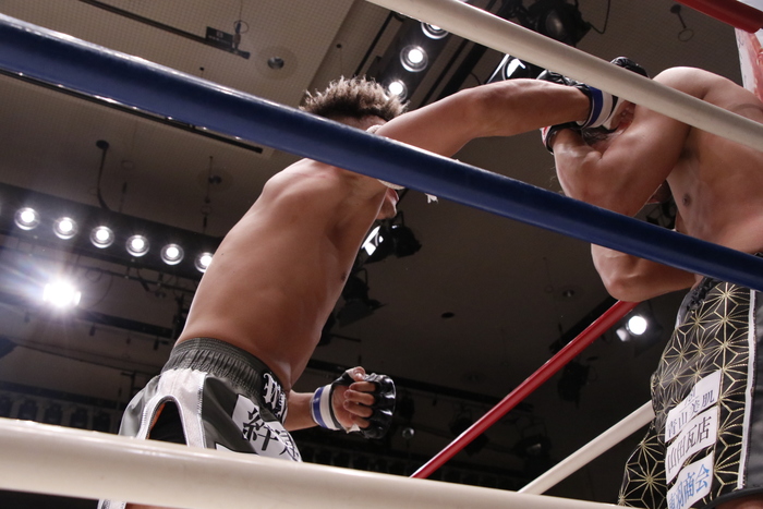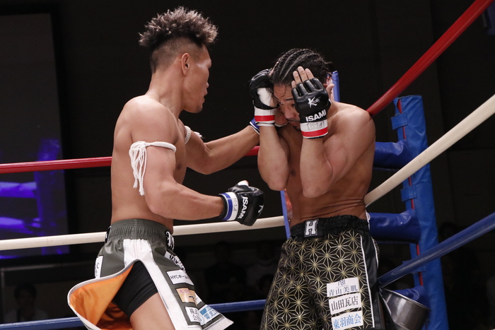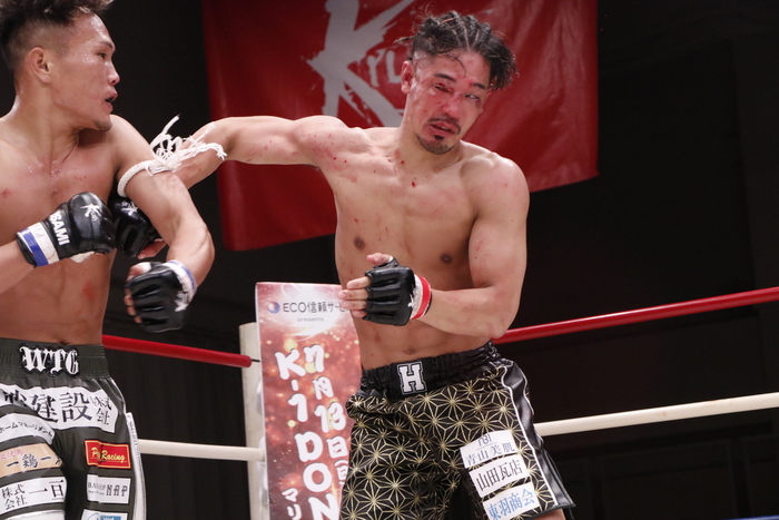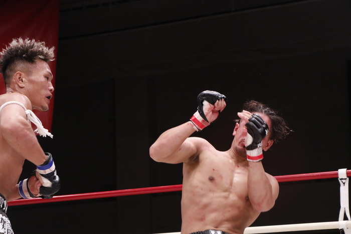 2R、龍が東本をコーナーへ追い込んでの連打。東本も左フックを打ち返す。ジャブの打ち合いで交互にのけ反るが、龍が右ストレートで2度連続東本をのけ反らせる。ミドルを蹴っていく東本だが被弾が多く顔が赤い。東本のローブローで試合は中断。再開後も思い切りパンチを振っていく龍に東本はダメージが見える。