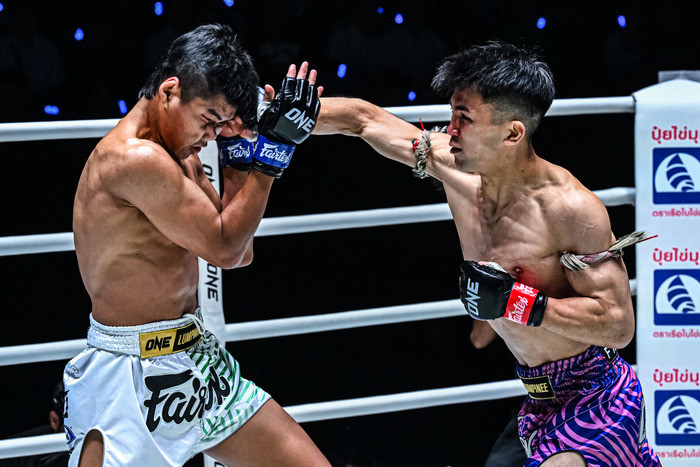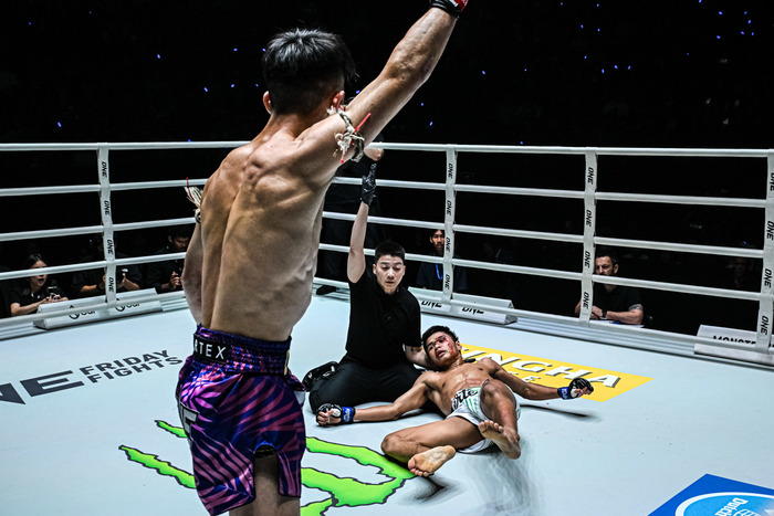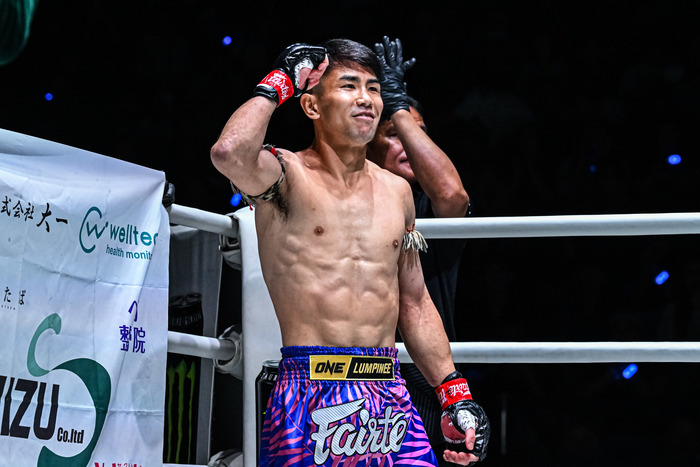 第3試合のキャッチウェイト(58.1kg)ムエタイ3分3Rで、ペットプーパー・エックプーイーン(タイ)から2度のダウンを奪い、KOまであと一歩まで追いつめた品川朝陽(エイワスポーツジム)。判定勝ちでONE復帰戦を飾った。