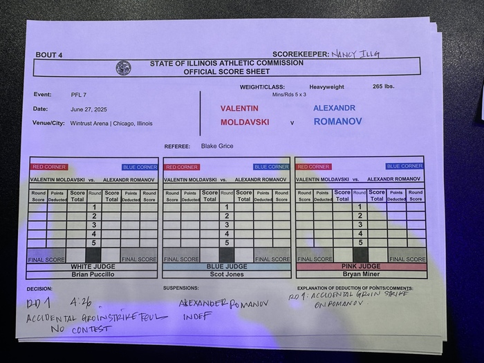 結果は偶発的なローブローによりノーコンテストも、決勝にはそこまでの判定でローブローを受けたロマノフが進出することがアナウンスされた。
