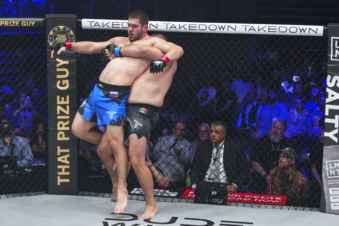 1R、サウスポー構えのロマノフ。オーソのモルドフスキーはワンツーの右。さばくロマノフもワンツーの左を突く。モルドフスキーの打撃に組んだロマノフは四つから崩して、残したモルドフスキーを持ち上げ反り投げでテイクダウン!