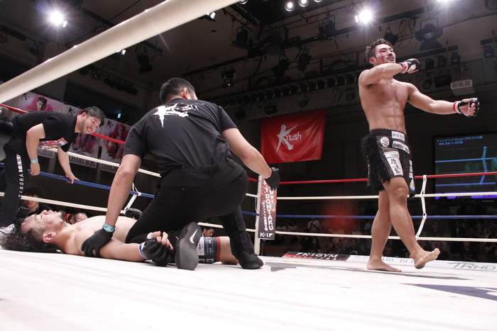 メインイベントでは、オープンフィンガーグローブ着用のKrush-OFGミドル級3分3R延長1Rが行われ、神保克哉(K-1ジム目黒TEAM TIGER)が夜叉猿(力道場静岡)を3R2分10秒、左フックによるKO勝ちを飾った。