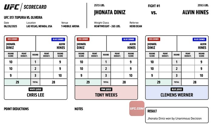 #UFC317 Official Result: Jhonata Diniz (29-28, 29-28, 29-28) defeats Alvin Hines via Unanimous Decision.
