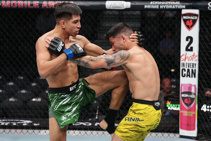 すぐに立つデルガドは、長いリーチから左ジャブから右ストレート。さらに首相撲左ヒザでダウンを奪うと、右ヒジ連打! レフェリーがすぐに間に入った。すぐに立ち上がるアミルだがフラついてケージに寄りかかった。