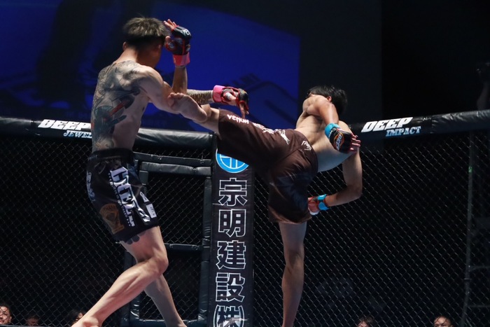 1R、ともにオーソドックス構え。武蔵は左ロー。伝統派空手の構えの久保田は右の跳び込み! 腰を落とした武蔵は立ち上がり。間合いを詰める武蔵が右で差して組み。体を入れ替え合い、右差しで崩す久保田。ブレーク。
