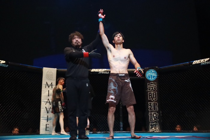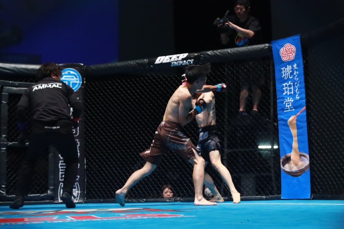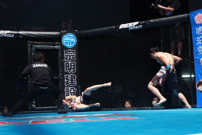 強引に詰める武蔵に左を当てる久保田。さらに右に回って左右を当ててダウンを奪い、パウンド。レフェリーが間に入った。