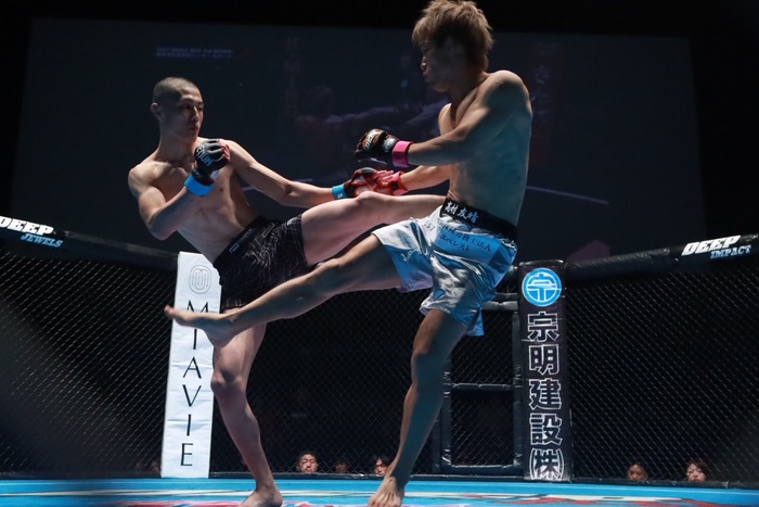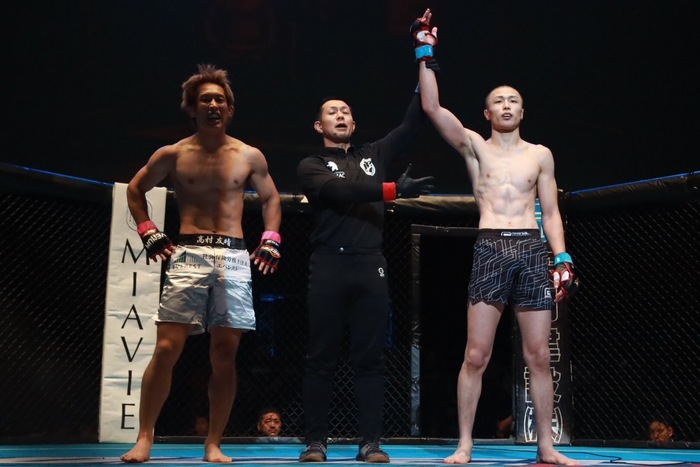 大空斗は左のサイドキック。左インロー、右を突くが、そこに組んだ高村がボディロックから崩し。ここも残した大空斗が四つからテイクダウンで上に。ハーフから左で差す高村に右小手、左でヒジを突く。