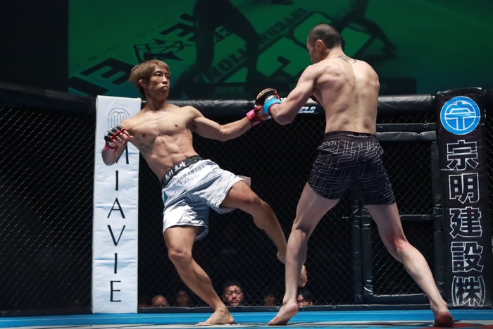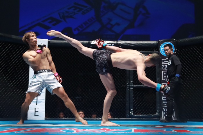 1R、ともにオーソドックス構え。高村は細かいステップ、大空斗はサイドキックを見せる。高村の左ミドルの入り。そこに右を狙う大空斗。