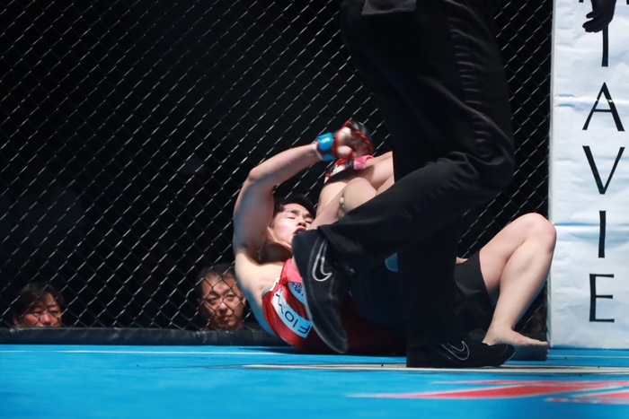 背中に背負うベンジャミンに渡部はボディトライアングルからリアネイキドチョークへ。2度後ろ手を剥がしたベンジャミンに、グラウンドに引きずり込んだ渡部は絞めてタップを奪った。
