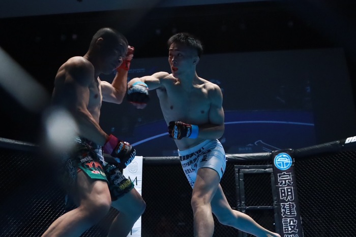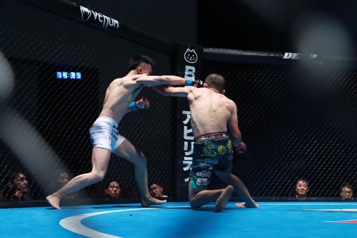 さらに左右フックで前に。右を被弾し、腰を落とした飴山は右を強振も空振り。ケージを逃れ左に回る飴山を追う安谷屋は左を突いて前に。さらに左に回り組ませない飴山。左ジャブを喉元に当てた飴山。さらにジャブで出入り。次はノーモーションの右を突く。飴山の右を潜ってダブルレッグに入る安谷屋は、左で差して押し込み。抜けようとする飴山に離れ際の右を入れた。