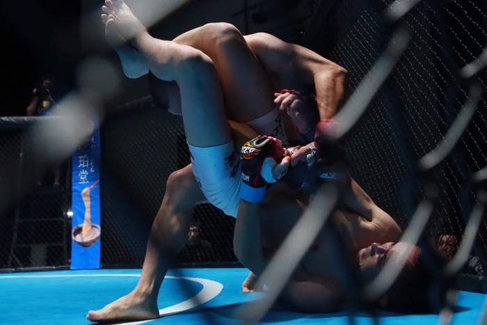 左前手フック、左ボディで飛び込む飴山をさばく安谷屋は右で合わせて、左で差して組み。ボディロックして後方にテイクダウン! 左ジャブを喉元に当てた飴山。さらにジャブで出入り。次はノーモーションの右を突く。飴山の右を潜ってダブルレッグに入る安谷屋は、左で差して押し込み。抜けようとする飴山に離れ際の右を入れた。