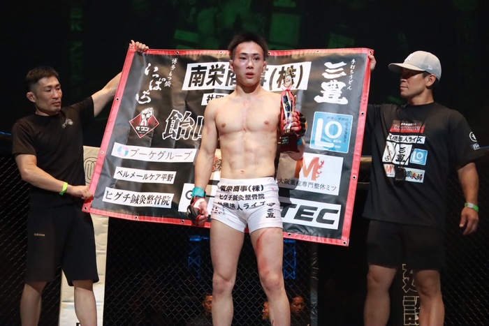2R、開始前、安谷屋のカットにドクターチェックが入り、ストップ。飴山のTKO勝ちとなった。