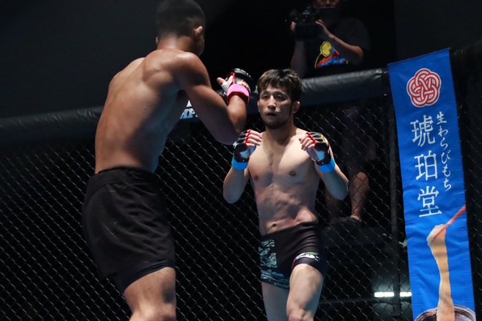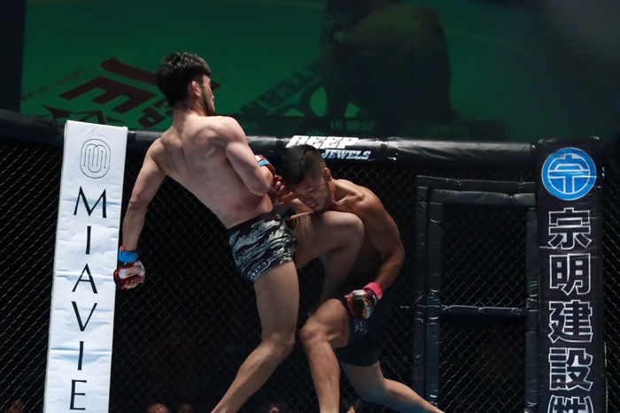 2R、左ジャブのダブルから先に組むTackだが、古根川は突き放す。右カーフのTackに古根川は右で前に。組むTackは左足をかけて引き込み。立ち上がる古根川は片足をかけるTackの送り手に動けず。両手を固定のTackも細かいヒザのみ。