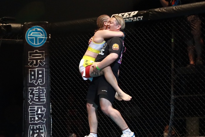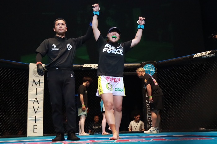 その手をアームロックに狙う樹季は背後のMANAの右腕を深く抱えて右手首を持つと、スタンドで上に上げでストレートアームバー!ヒジが極まり、MANAがタップした。