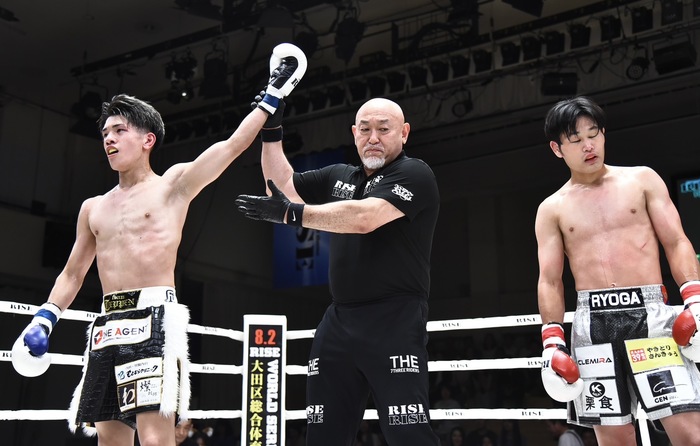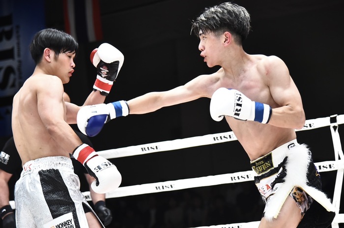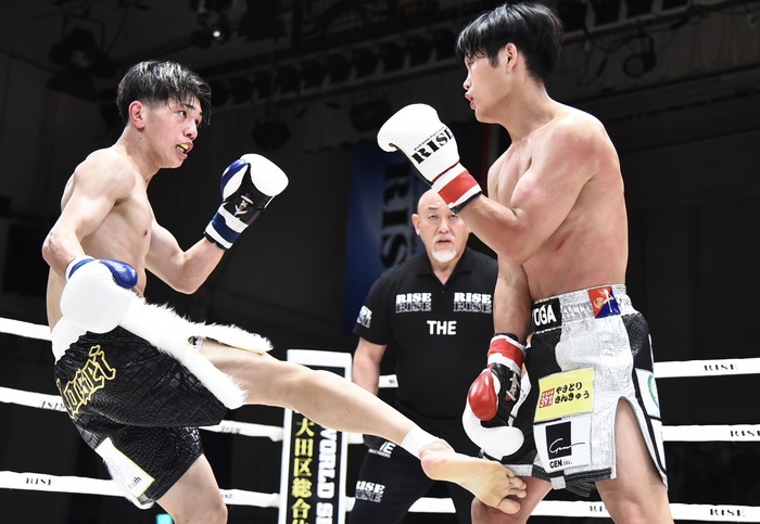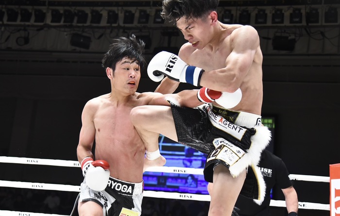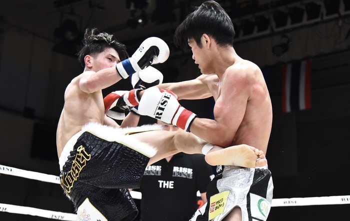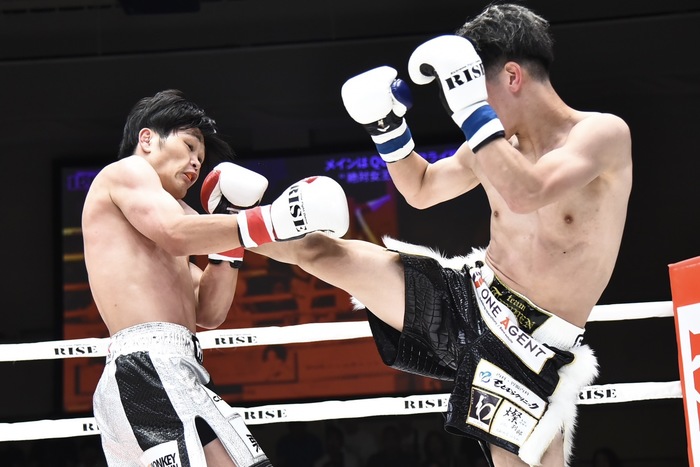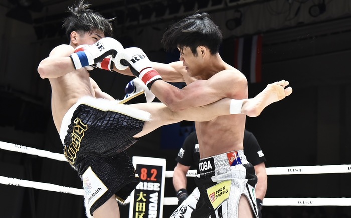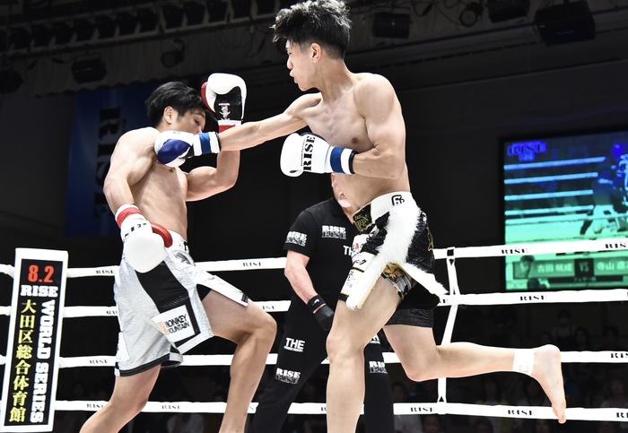 1R、寺山はサウスポーから左インローで先制、右へ動きながら右ロー、左ミドル。吉田も前へ出ての右ミドルを入れる。前へ出てくる寺山を左フック、右ストレートで迎え撃つ吉田。飛び込んでの右をヒットさせる吉田に寺山は左ボディストレートを返す。吉田は頭を振って寺山の空振りを誘う。