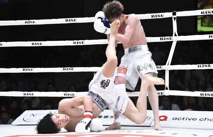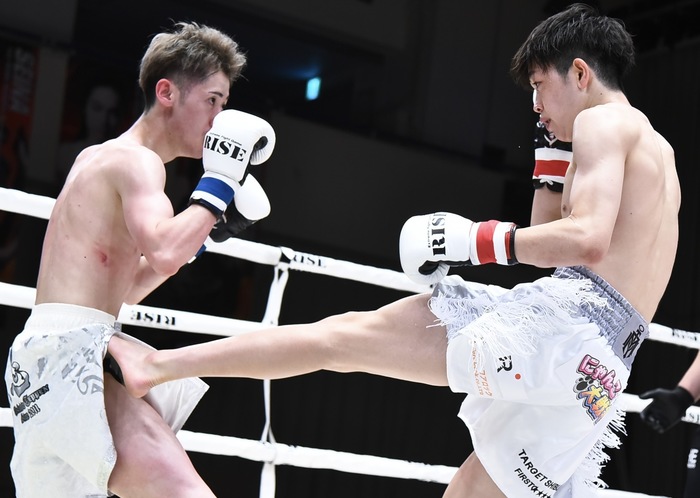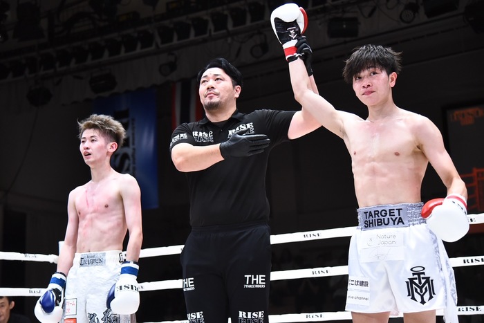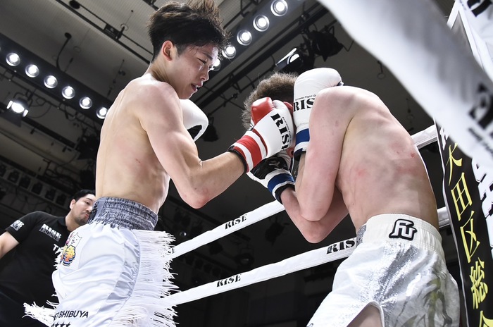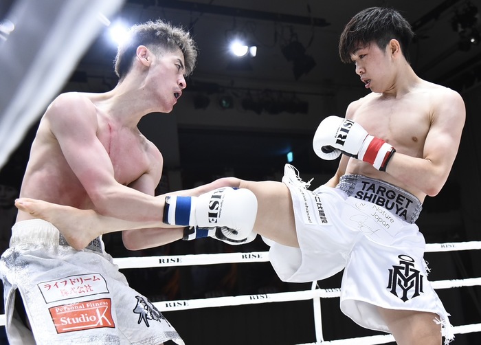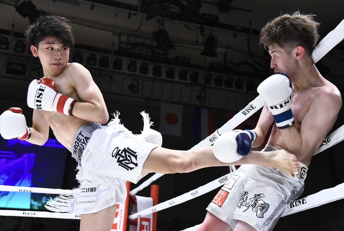 1R、両者サウスポー。右インローと左ローで前足を狙う松本。互いにジャブを突き、松本は左カーフも蹴る。ジャブを突いていく松本に平山は前蹴り、ワンツーから右ミドル。両者とも距離がまだつかめてないか、空振りが続く。