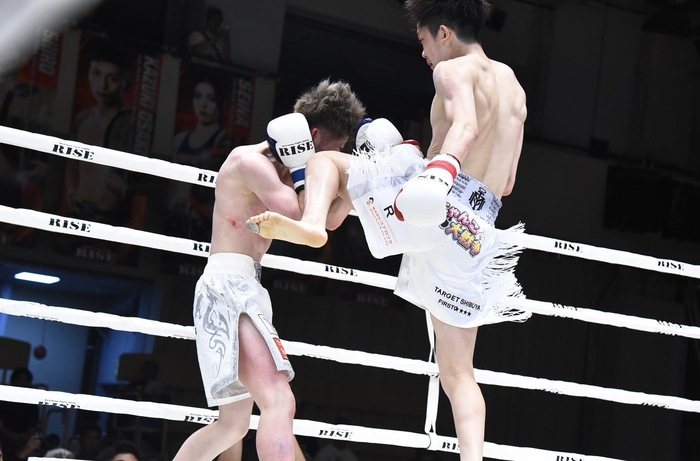2R、松本は左カーフを連打、平山は松本の蹴りをキャッチするとそのままヒザを突き刺し、ボディを打つ。ここから平山のテンカオが当たりだすが、松本の左フック強打がヒット。