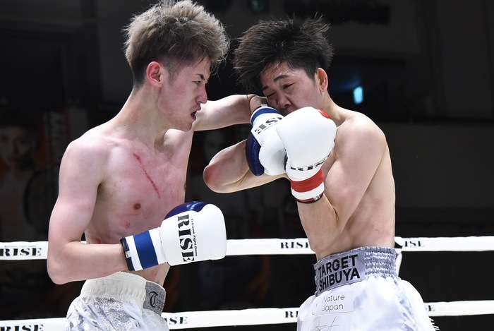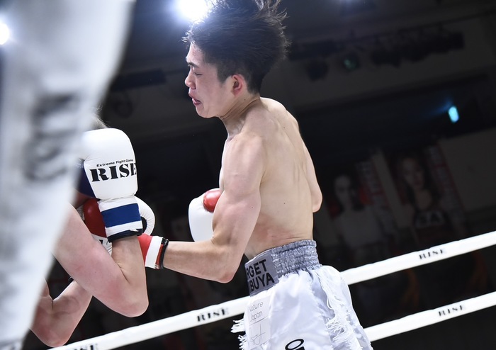 3R、まるで2Rの続きのように平山にロープやコーナーを背負わせる松本。左ショートフックから左ロングフック、右フックからの左ボディ。平山は右ローで対抗するが、松本は左ストレート、右ボディからの右アッパー。スーパーマンパンチのような左フックも連続ヒット。松本は低い体勢からアッパーを突き上げる。