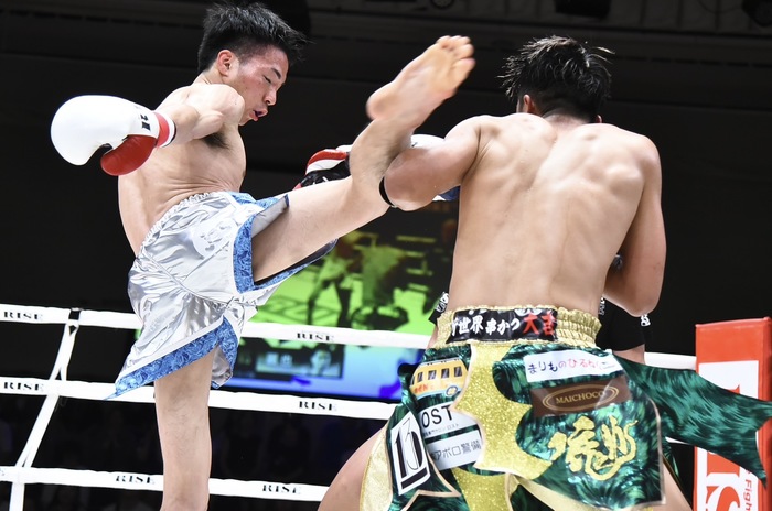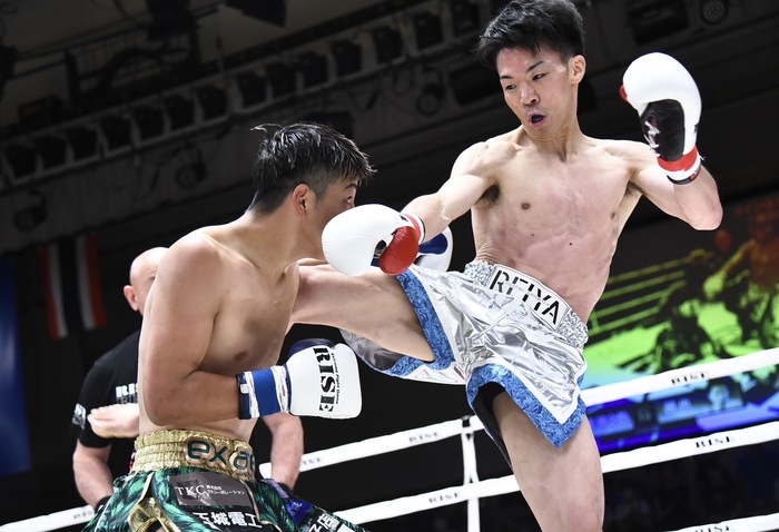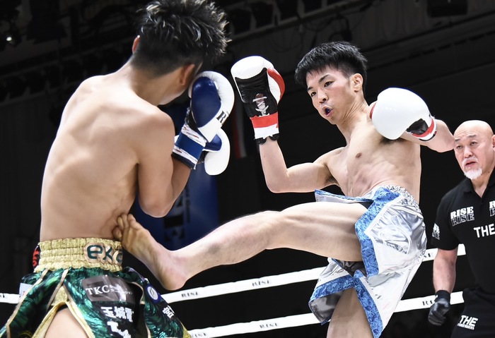 2R、スピーディーな攻防をする両者。麗也が左を当てるとすぐに伊藤が右を当て返す。ステップを踏んで動く伊藤にどんどん前へ出る麗也。伊藤は回り込みながら左フック、左インロー。すぐに麗也が前へ出て右ローを蹴る。伊藤は左右ボディを叩くと後ろ蹴りでボディ攻め。麗也は伊藤のカーフをしっかりカットしてワンツー、右ロー。伊藤もワンツーを返す。互いに手数を出す白熱の展開に。