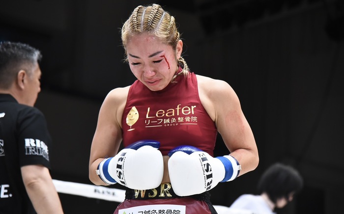 1R、いきなりMeltyがパンチの連打で仕掛け、打ち合いに。この中で突っ込んだMeltyの頭がYAYAに当たり、左目上をカットして流血。ドクターチェックに。