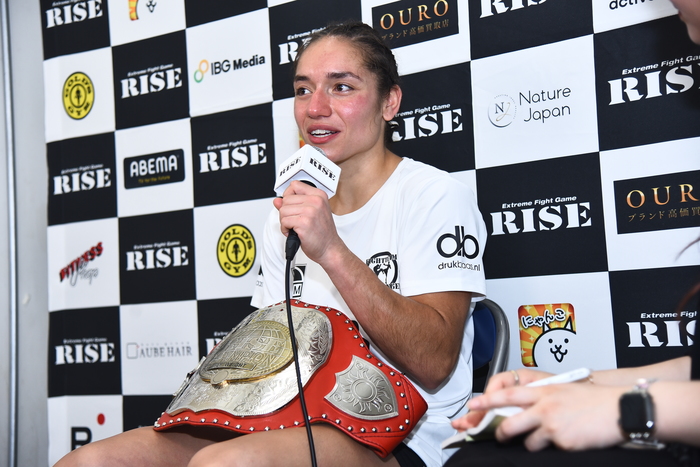 そのメインイベントで同級1位・小林愛三(NEXT LEVEL渋谷)の挑戦を判定3-0(50-46×3)で退け、2度目の王座防衛に成功したRISE QUEENフライ級王者テッサ・デ・コム(オランダ/Fight team Vlaardingen)が試合後インタビューに答えた。