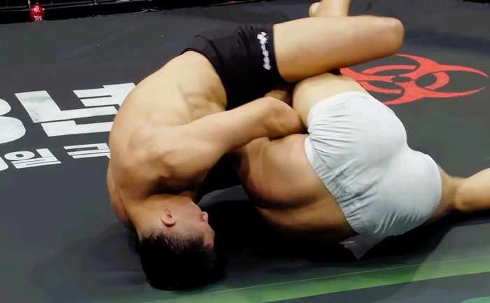 追いかけるソンヒョクの右の強振に、カウンターのダブルレッグでマット中央でテイクダウンを奪う河名! 下からのソンヒョクの腕十字、三角絞め狙いをかわして中腰からパウンド。そこに草刈りで蹴り上げを打つソンヒョク。