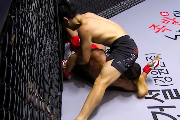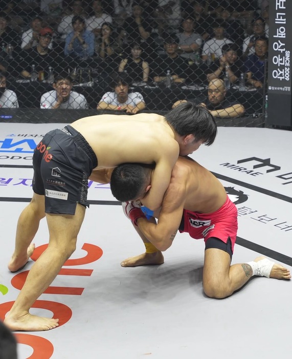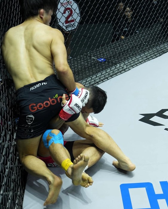 ヒョングンの左足の下にをいったん自身左ヒザを入れて横に崩すと、左で差してマットに背中を着けさせとハーフから右ヒジ、パウンド。そのスペースでヒョングンが身体を起そうとすると右でがぶり、ギロチンプレッシャー。ケージに押し込み極めようとするが、ヒョングンが首を抜いたところでマウントになり、ゴング。