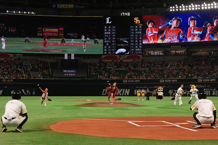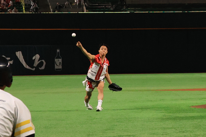 セレモニアルピッチでは、マウンドで3人が横に並び、朝久と石井はノーバウンド投球。K-Jeeは力が入ったのか、スピードのある球をワンバウンドでキャッチャーに投げ込み大きな歓声が球場からあがった。