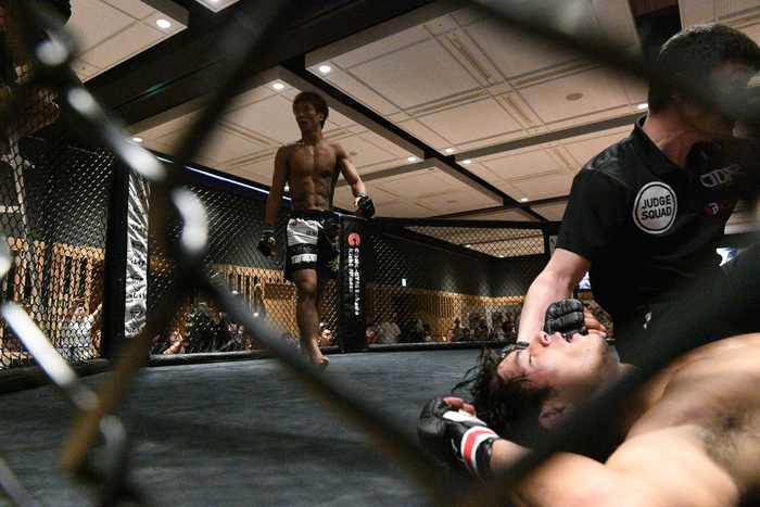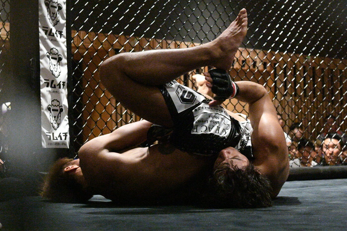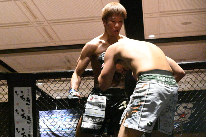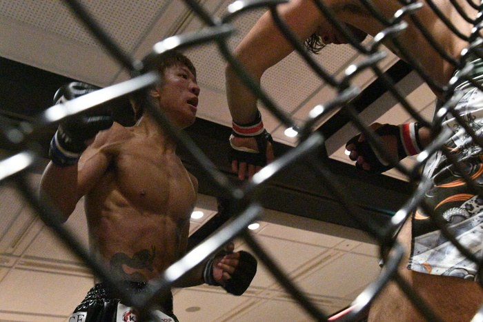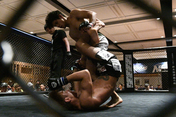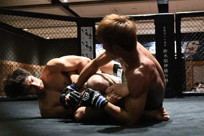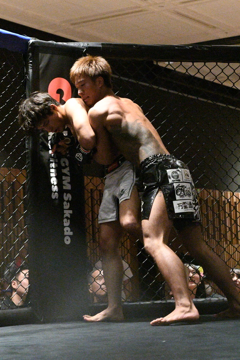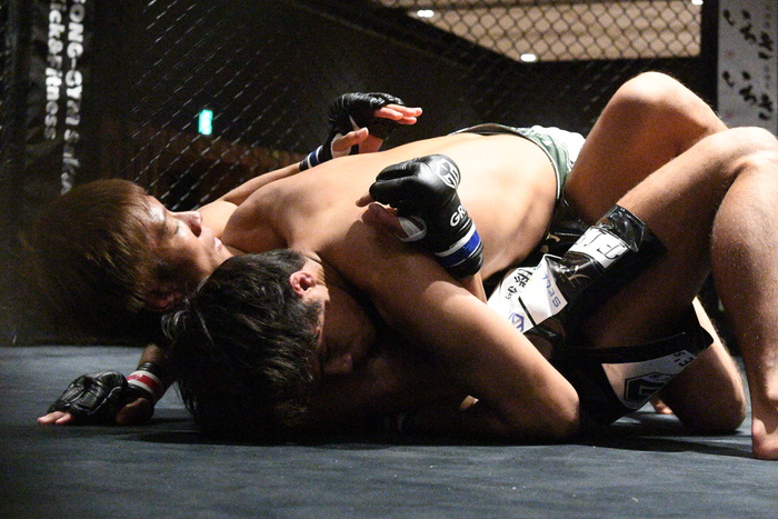 ハラダは左右フックからダブルレッグへ。ケージ背に崩れても戻す千春にハラダはボディロックテイクダウンでサイドに。背中着いた千春は下から細かいパンチ。ハラダはサイドから押さえ込み、右枕にするが、ここでブリッジでリバーサルした千春が上に。