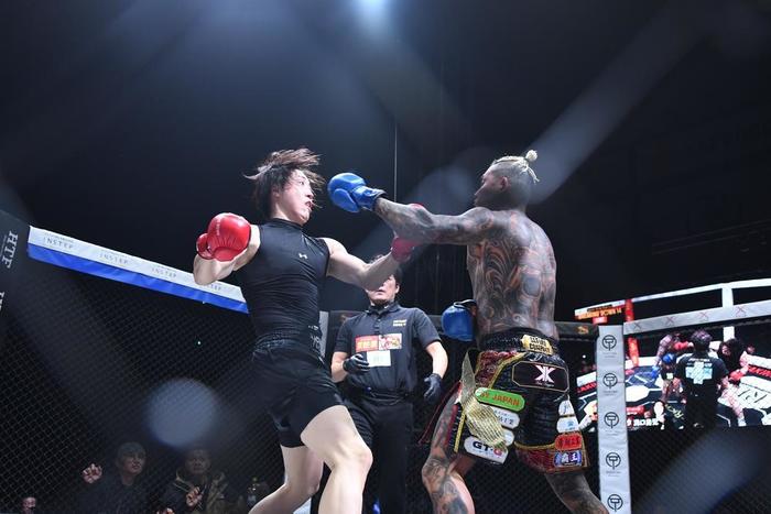 【写真】2024年12月の『BreakingDown 14』で溝口COO(左)はSATORUにダウンを奪われ劣勢の中、残り1秒で逆転KO勝ち