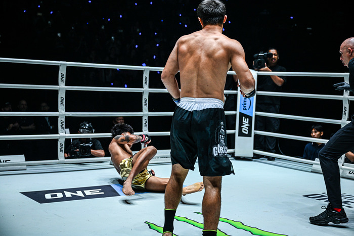 さらに右を突くと、そこにノンタチャイは右アッパーも、ダヤカエフは右から左のショートフック! 回転速くカウンターで合わせて24秒KO勝利。5万ドルボーナスを獲得したダヤカエフはONE4連勝。