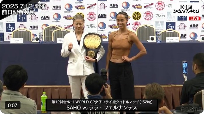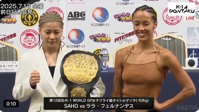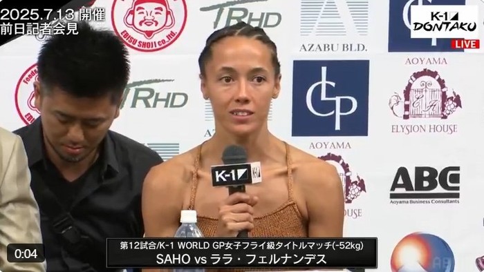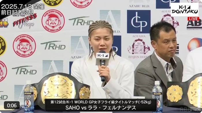 また、6月29日の『RISE』でRISE QUEENフライ級王座を防衛したテッサ・デ・コム(オランダ)が、試合後に「自分が戦いたいのはK-1のSAHO選手」と名を挙げたことに対して「私もその選手は見ていて強いなとずっと思っていて。まさか向こうから私の名前を挙げてくるとは思っていなかったので、ぜひK-1の舞台で呼んでくれるならいつでもやるのでやりたいです」と、いつでも受けて立つと話した。