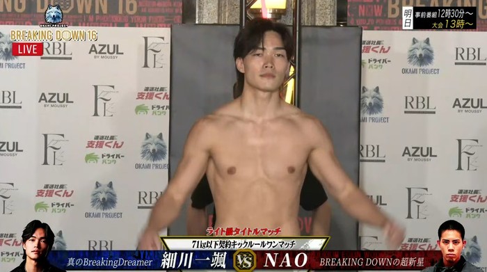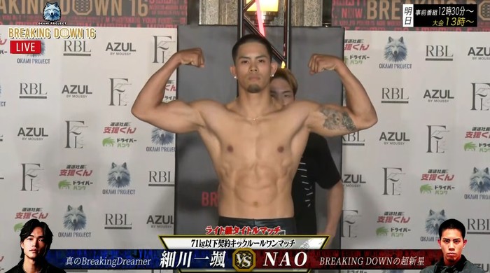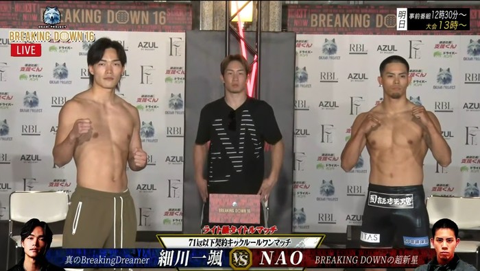 第28試合のキックルールBreakingDownライト級タイトルマッチで対戦する、王者NAOは70.95kg、挑戦者・細川一颯は70.7kgでそれぞれ計量をパスした。