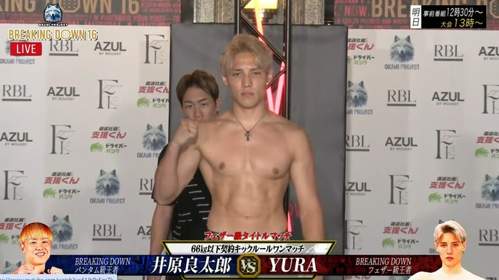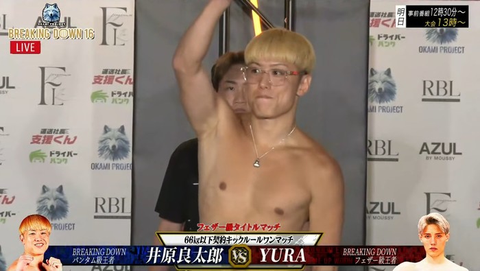 第29試合のキックルールBreakingDownフェザー級タイトルマッチで対戦する、王者YURAは66.0kg、挑戦者で同バンタム級王者の井原良太郎も66.0kgで計量をパス。